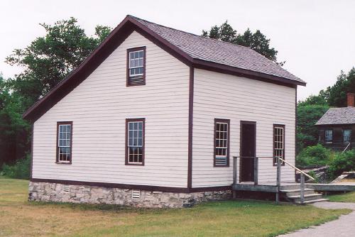 The village school is long gone, but this room displays what items might have been in it. In addition to these desks, the room also has copies of the primers that children learned to read from. |