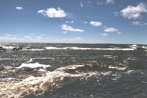 Shot of the lake from in front of the falls showing the roaring river water meeting up with the lake, which was in a somewhat roaring state itself that day. |