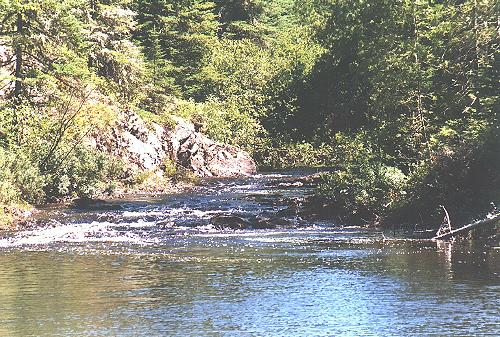 | A shot of a huge, old tree trunk next to the river. It's size and cut end (on the right) to me would suggest that it was lost during logging operations in the era long ago. |