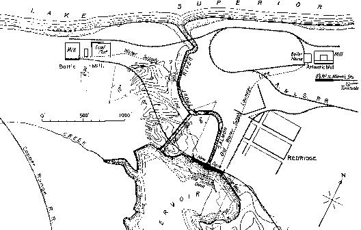 The Baltic Mining Company was organized in December of 1897 and began mining in a section of land directly to the south of land owned by the Atlantic Mine. Seated on the board of directors at the Baltic were also members of Atlantic's board, so when the new company had a need for somewhere to stamp their ore, they naturally turned to Atlantic's stamp mill. In July of 1899 Baltic began stamping test runs of their ore using one head of stamps at the Atlantic mill and continued doing so for the rest of the year. The director's report stated that he thought the stamping could be much improved since they were using an old style head and screens not well suited to their rock.(17) In the mean time a site was chosen for Baltic's own stamp mill on the shore of Lake Superior directly across the Salmon Trout River from the Atlantic mill. When the final bill for the new stamp mill and all supporting structures (including the steel dam, which will be discussed later) was tallied in 1901, Baltic had spent a total of $341,636.28.(18) No fuss was made this time about the cost of construction, as copper prices at this time had boomed and the company needed it's own mill and not a shared one with Atlantic. Access a more detailed 1908 Sanborn representation of the Baltic site here.(38)