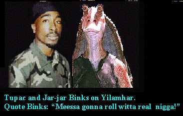 We, the Children of the Thug Immortal have been outraged at the recent media attack on gungan Jar-Jar Binks. It appears that George Lucas is actually using REAL aliens in his Star Wars movies, instead of actors and puppets, like he would have us to believe. The alien Binks is really distraught over the negative press his role has received, because he has always had a deep admiration for Earth culture, particularly when it comes to African Americans, and more specifically, Tupac and Hip Hop.
