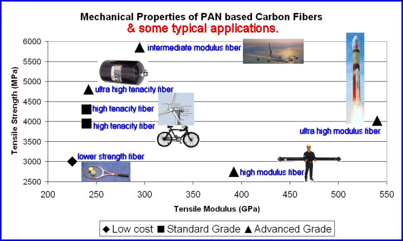 Specialized carbon fibers such as intermediate and high modulus
