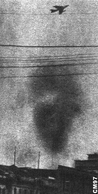La Moneda being bombed. The great professionalism of the FACH pilots allows them to hit the target without missing and causing damage to other buildings in downtown Santiago.