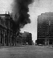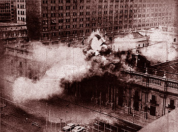 La Moneda siendo bombardeada. La gran profesionalidad de los pilotos de la FACH hacen que le den al blanco sin errar y causar daño a los edificios aledaños en el centro de Santiago.