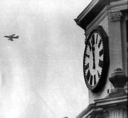 Aviones Hawker Hunter de la FACH sobrevolando La Moneda antes del bombardeo.