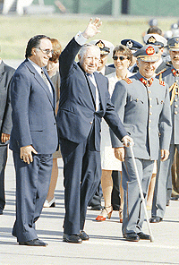 Pinochet in good spirits, walking, after he arrives in Santiago's Arturo Merino Benitez international airport.