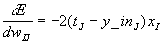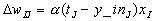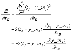 Believe it or not, we have just derived the delta rule. Because the rule is commonly left in the form shown in figure 13, the rule is called the delta (D ) rule. Instead of giving the new weights, the delta rule tells us the change in the weights. To find the new weights, add the value obtained by evaluating the delta rule to the existing weight along the connection. We have encountered all the variables in the expression for the delta rule before. Just to refresh your memory, a is the learning rate constant, tJ is the desired output for node J, y_inJ is the input to the output node J, and xI is the output from input node I.