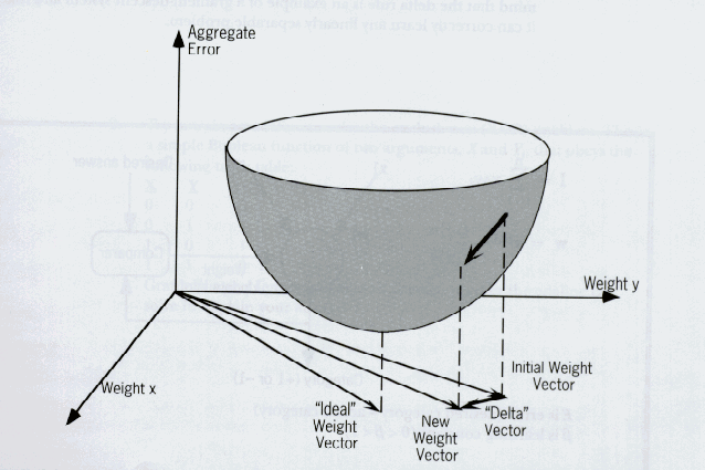 The training algorithm derived above is the most common form of the generalized delta rule, however certain researchers have made various improvements to the rule. One change, that dramatically improves the learning process, is the addition of a momentum. If you perceive the error function as a three dimensional surface, with the weights as the x and y axiss and the error as the z axis, placing a marble anywhere on the surface will represent the initial weights of the neural network. Training the neural network using the generalized delta rule is then akin to letting the marble go and having it settle in a valley of the surface. The location of this valley, a local minimum for the error, represents the final weights produced by the training algorithm. If our comparison is to be perfect, we must move this entire system to a place where the laws of physics cease to exist. More specifically, the ball should have no momentum. It should not gain speed as it descends down the hill to the valley, instead it should have a constant speed.