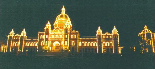 British Columbia's Parliament Building, in Victoria, outlined in lights.