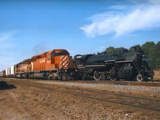 An East-bound Wisconsin Central freight drag, led by Canadian Pacific Railway # 6013, passes through Irvine Yard as Soo Line Mikado (2-8-2) Class L-1 # 1003 awaits a "call to duty".