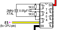 The clock input can be a little difficult to generate if you're not familiar with analog electronics. Because the timing of it is so precise, you cannot simply manually cycle the clock by flipping it from low to high with a switch. Doing this will make a split-second instability during each transition, because whenever you press or release a hand-operated switch, the circuit state does not go instantly from low to high, or high to low; Rather, it fluctuates between them for just a fraction of a second. Although it doesn't seem like a long time to you, the clock input of a CPU is so sensitive that trying to pulse it by hand will make the CPU crash instantly. (This behaviour of switches is called "switch bounce", and is an inescapable fact of life when working with switches in electronics.)