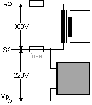Sie sehen einen einphasigen Verbraucher für 380V und einen für 220V (zB. einen Computer). Die beiden haben eine Phasensicherung gemeinsam.
