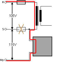 Der Strom rinnt trotz der durchgebrannten S- Sicherung weiter, als ob nichts passiert wäre. Oder doch, es hat sich was geändert: die beiden Verbraucher werden mit völlig falschen Spannungen betrieben! Die Zahlenwerte im Bild sind zufällige Werte, es kommt auf die Größe der beiden Verbraucher an.