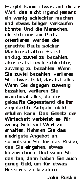 Es gibt kaum etwas auf dieser Welt, das nicht irgend jemand ein wenig schlechter machen und etwas billiger verkaufen könnte. |