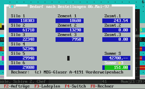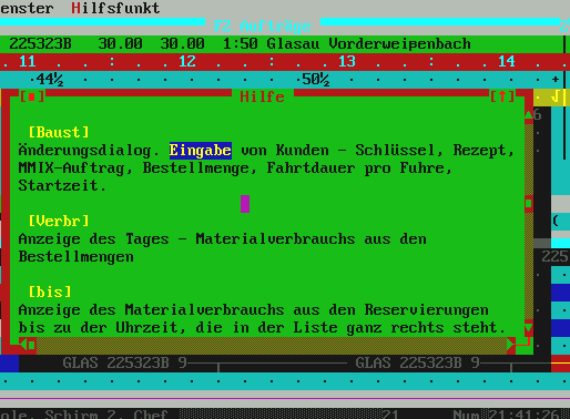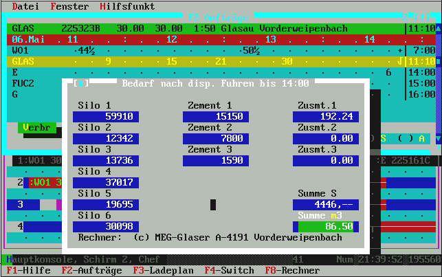 seiner Mischwagenflotte. Das Programm läuft auf dem selben PC in der Mischanlage, auf dem auch das MMIX-Programm zur Mischungsanforderung, Kunden- und Rezeptverwaltung und für den Lieferscheindruck läuft. |