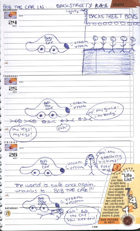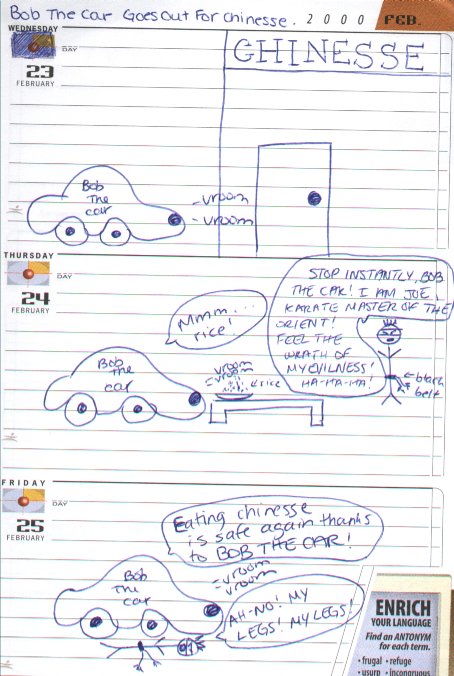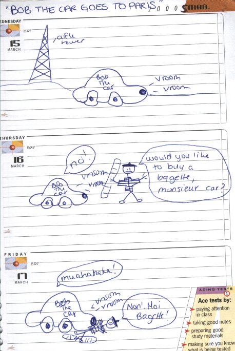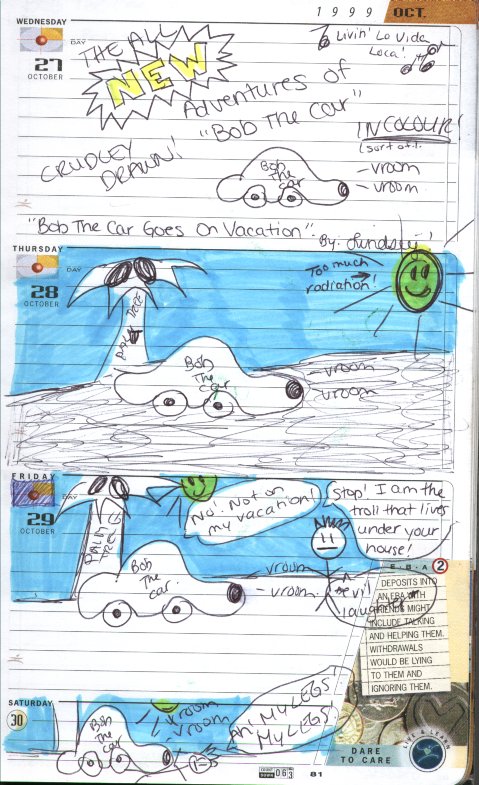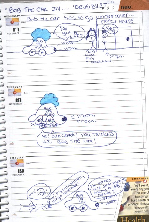 One day in Data Processing Class, the computers decided that they didn't want to work. So, we got to go into a cool new room-- THE WOODWORKING ROOM, where sawdust fell from the ceiling, coating us in its dusty-goodness. Anyways, the teacher had been licking too many computer screens, so I decided to draw some cartoons in Katie's agenda. After a few pages of doodling, Bob The Car was born. For your viewing pleasure, we present "The Best Of Bob The Car".