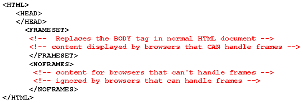 FRAME BASICS A Frameset document has the basic structure of a HTML document, except the BODY container is replaced by a FRAMESET container which describes the sub-HTML documents, or FRAMES, that will make up the page. (CAUTION: Putting the FRAMESET data inside the <BODY> tags will cause the FRAMESET to be ignored.)