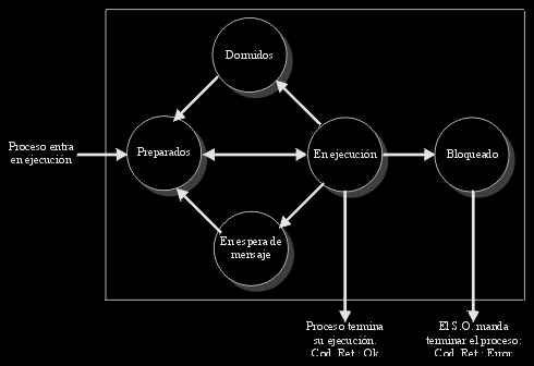 En un momento dado pueden pasar al grupo de dormidos, o bien terminar su ejecución, dejando por lo tanto de estar en el sistema. Para que un proceso llegue al estado de preparado, hay dos caminos, uno que comience su ejecución, con lo cual por defecto se va a ejecutarse parte de su código, o bien en segundo caso, que lleve ya un tiempo en el sistema, y estando dormido, le llegue una señal que lo active de nuevo.