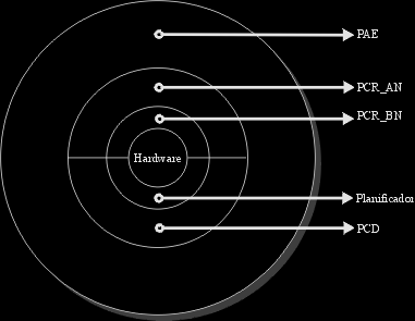 Ahora que ya hemos visto, los tipos de procesos existentes y las cualidades que les caracterizan, los podemos jerarquizar, en un diagrama típico de anillos, en el cual se puede ver de una manera muy gráfica, como transcurrirá el flujo de información a través de la funcionalidad del S.O. Este gráfico no requiere más comentario que, si ha quedado claro lo anteriormente expuesto no habrá problemas en su comprensión.