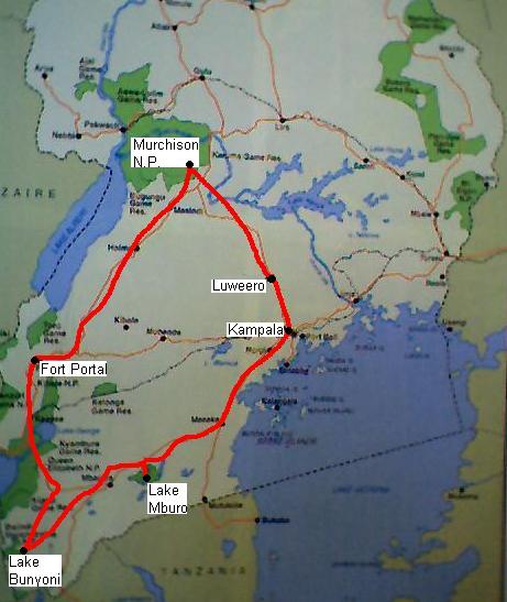 I don't know how we are going to get through it all as we were planning on going travelling for a week from tomorrow. We are considering heading north-west initially to Murchison National Park where we can apparently see wild lions, elephants, hippos etc. We are slightly concerned about the heat - it is meant to be in the 40s there thhese days. After that we will head down along the Congo border to Fort Portal. It is up the mountains a bit and so should be nice and cool. After a day or so there we will continue south to Lake Bunyoni which is meant to be particularly beautiful. On our way back to Luweero we may spend a night at Lake Mburo where I visited during the Christmas holidays to break up the journey. To see our proposed route, click on the picture below
