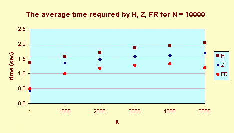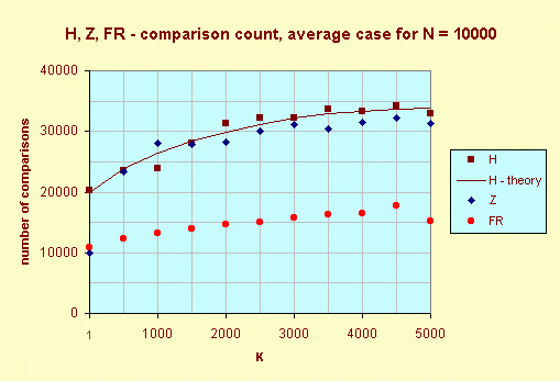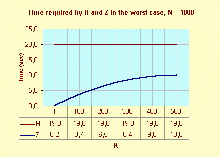 In worst case the number of comparison for the algorithm H doesn't depend on K. But for the algorithm Z the number of comparison depends on K. The following graph shows the time of execution H and Z in worst case. ![]()