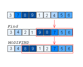 MODIFIND stops work with the number 4, when it know that 4 can't be 7th smallest element. It will find 5th smallest element in the subarray 8, 9, 1, 2, 7, 5, 6. But the swaps the numbers 1 and 2 are unnecessary! This numbers don't change your position during execution of the MODIFIND algorithm. We can suppose (for the average-case analysis, counting swaps) that MODIFIND finds in the second step 3rd smallest element in the subarray 8, 9, 7, 5, 6.