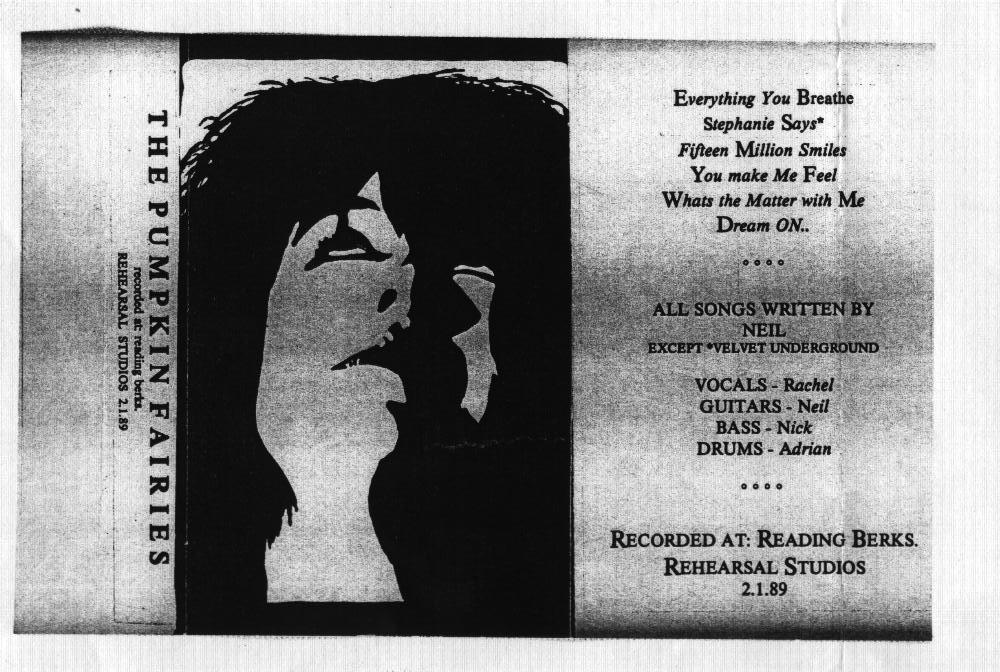 The Pumpkin Fairies record and release their 7 song cassette demo. It was recorded on 2 Jan 1989 at Reading Berks Rehearsal studios, when Neil was 18 and Rachel just 17. The tracklisting is as follows: