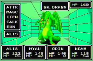Undoubtfully the best graphics ever seen on any 8 Bit console. 3D animated dungeons and battles, with many kinds of monsters, which are both creative and fit the place and the time. During the battles, there are backgrounds, 3D as well, fitting the kind of surface you were walking on.