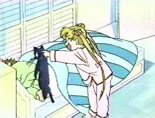 | Serena was having a nightmare. A huge monster was chasing her, but then Tuxedo Mask appeared and saved her. He said that he would always be with her. Serena was holding on to him and had hearts in her eyes. | Serena was woken by someone shouting in terror. She went into Sammy's room and saw that Luna was there. Serena remembered that Sammy was afraid of cats so she teased Sammy. Sammy was saved when their mother called them down for breakfast. | At breakfast, Serena showed Luna to her parents and asked if it was okay to keep her. Sammy was against it and they started arguing. Their parents just smiled and told them to decide it amongst themselves. Serena and Sammy sighed in resignation. |