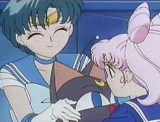 | In the ruins of Crystal Tokyo, the Sailor Scouts stand looking at the Crystal Palace, amazed at the devastation and wondering why it was so easy for the enemy to overwhelm the defenses. Rini, staring, drops Luna Ball and doesn't notice. Sailor Mercury returns it to her. Luna worries about Sailor Moon and Tuxedo Mask, and Mars is ready to go out and find them when Endymion appears. | In a monitor room, he shows them an image of Sailor Moon and Tuxedo Mask approaching. The Scouts run out to meet them and are overjoyed to see Sailor Moon all right. But when Sailor Moon starts crying, Mars starts in on her as usual, asking why she's crying now. Sailor Moon's just glad to see them all, even Mars who always picks on her. Rini looks on at them as Mars starts yelling that she's NOT picking on her. | In the Palace, they go to the chamber where Neo-Queen Serenity is suspended in crystal. Sailor Moon, somewhat unbelieving, looks at her future self. |