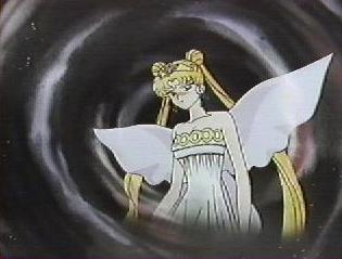 | The Wiseman told Rini that she was right, and that nobody loved her. Rini saw images of her family and friends hating her as her body absorbed more and more Dark Energy. Wiseman said she should fill herself with hate and want to destroy the Earth. Rini cried out that no one loved her. Her body was filled with Dark Energy and she started to transform! |