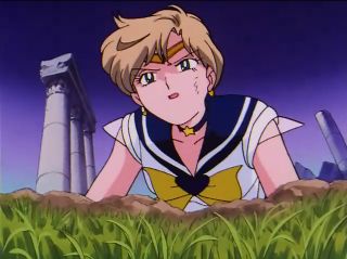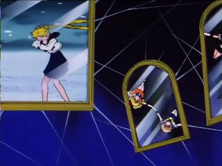 Nehelenia was angry that the Sailor Scouts were coming to aid Sailor Moon. Nehelenia said she would destroy everything that Sailor Moon loved. Nehelenia hurled her wine glass violently at the mirror which showed the Sailor Team approaching. The mirror shattered, then reformed itself. In the space where the nine girls were travelling, Sailor Uranus spotted a shower of enchanted mirror shards approaching. "Don't let go," ordered Sailor Uranus, "she's trying to split us up!" However the mirror attack was too fierce; the circle was broken and each girl hurtled off into the void! | Sailor Uranus awoke to find
