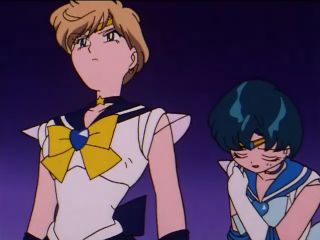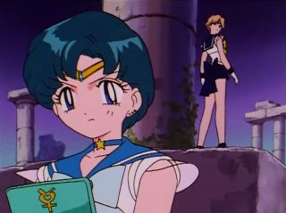 | Mercury tried using her computer but could not detect any of the others. Sailor Uranus said she was going to scout ahead "Don't fall behind!" she commanded, then sprinted ahead. Sailor Mercury was impressed by Sailor Uranus' great speed, but then realized she couldn't keep up. Mercury remembered herself as a child not being able to play basketball with the other children because she had to go to extra study class every day. Sailor Mercury knew she wasn't as strong physically. Sailor Uranus felt that her pace was off, then realized that she was accustomed to running in synch with Sailor Neptune. | Mercury and Uranus reached a