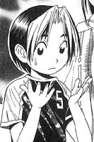 volume 5, page 113 Kishimoto managed to avoid doing anything too horribly wrong because he only showed up in his school uniform. Until this shirt. It has big shiny elbow patches much like your elderly literature professor's sports jacket! If Kishimoto lost the patches it really wouldn't be so bad, but Obata likes to make things look weird.