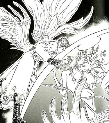 As usual, new piccie. From Trigun. You all know about Trigun I'm sure. Anyways, that's from the manga, drawn by Nightow, blahblahblah. Niqaeli suggested the series. I of course am highly amused by the plant things with the bare chickens growing out of their backs, so of course I had to use an image of one of them.