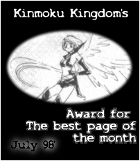 YEAAAAHHH!!! My first Page of the month award for July 1998 (I got it early ^_~) With my two favorite characters Sailor Star Healer(Yaten) and Kurama. Aren't they kawaii ^.^ A BIG THANKS to Mandy (a.k.a. Tiga and Seiya Kou) Thanks Bro' ^.~