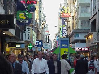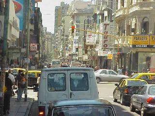 道の真ん中には新聞等を売るスタンドや花屋、公衆電話があります。公衆電話は非常に多く使い易そうでした。以前はブエノスアイレスの電話は非常に悪く、かけてもまともに繋がらない、違う番号に繋がる、申し込んでも線を引けない最悪の状態であったそうですが、民営化で状況は一変して、今では非常に効率が良くなっているそうです。繁華街は「サンタフェ」「ラヴァージェ」等がありますが、中でも有名のが「フロリダ通り」でしょう。この通りは7月9日大通と4ブロック離れて平行しています。歩行者専用となっていて両側には高級な商店、レストラン、映画館等が立ち並び何時もものすごい人出です。