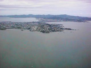 上空から見ると写真のように島側と大陸に跨り街が伸びているのがわかります。