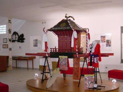 展示されている中央に立派な神輿がありました。この史料館をとりまとめた谷川さんの話では、当初は盗難・紛失を恐れて出来るだけケースに収納しようと意見が強かったが、小物を除いてそのまま展示するようにしたと説明していました。