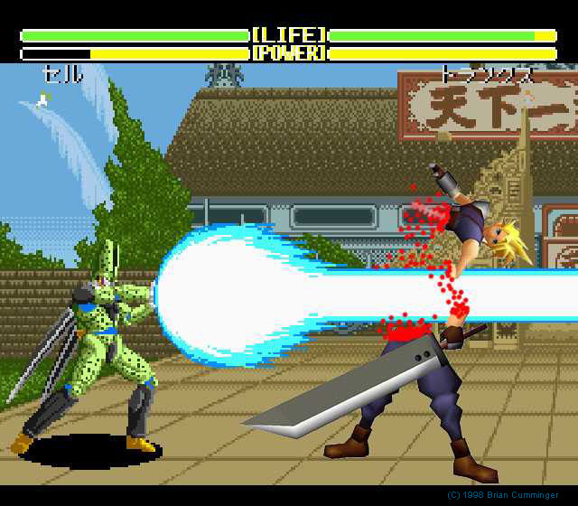 "Reminds me of my fake doom pictures 4 years ago.(hey, that gives me an idea :D ) This is the possible outcome of a battle between Cell (Dragon Ball Z) and Cloud (Final Fantasy 7). This was just a quickie about a week before the opening of this site so I never bothered to enhance the fireball. But I did draw a good spine :)."