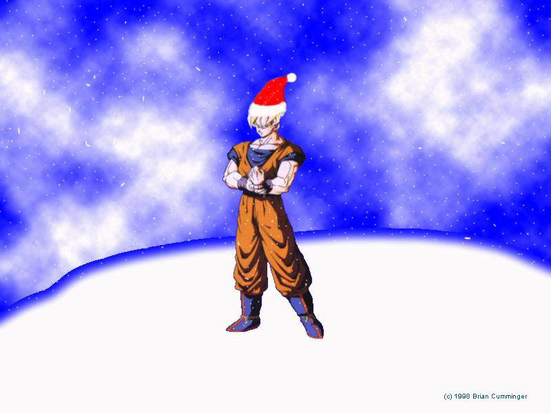 "Another DBZ Image, This is something I whipped up for myself as a christmas windows background. The image is Son-Gokou on a hill of snow with a santa hat on. I forgot to take into account the fact that Photoshop is anti-alias oriented and as a result there is a horizon-looking error on the top of the snow hill, but the rest turned our pretty good."