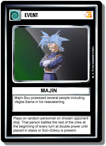 "Some Startrek CCG cards can be sooo boring, so I decided to make my own. This is an event called 'MAJIN' that posesses one person and makes them fight every person within it's range at double stregnth. It wasn't hard to make a sard template because at www.decipher.com there are full-quality scans of all the cards. Would be funny to print and use in a real game."