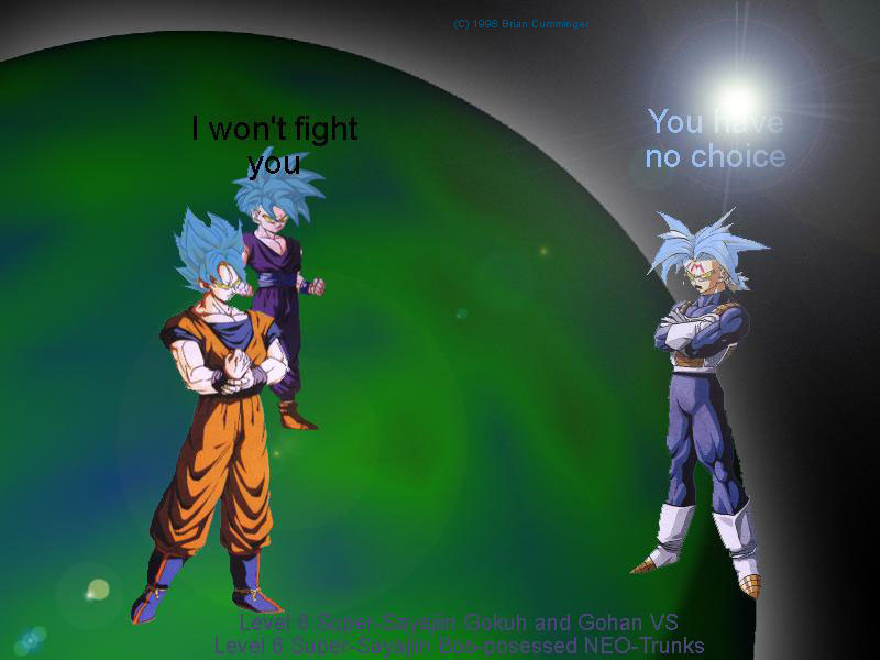 "Yet another Dbz Image. This is my first rendition of a Level 6 super-sayajin majin buu-possesed trunks vs a Level 6 super-sayajin gokou and gohan. Fair bit of work. Eye and Hair color changed, the planet (yes, that's a planet) is just a gradient and no stars."
