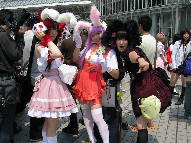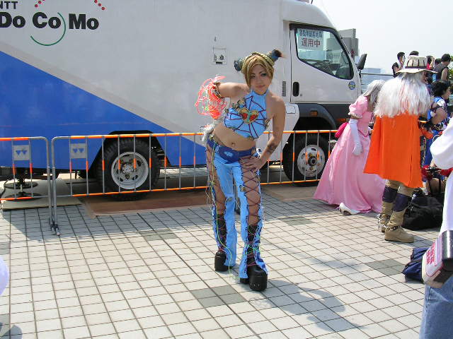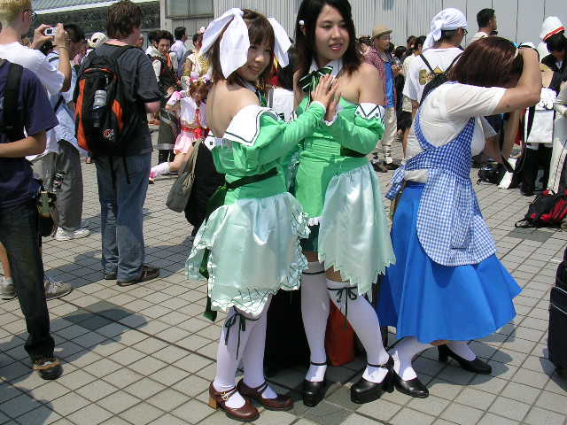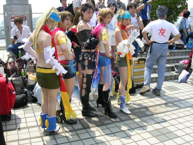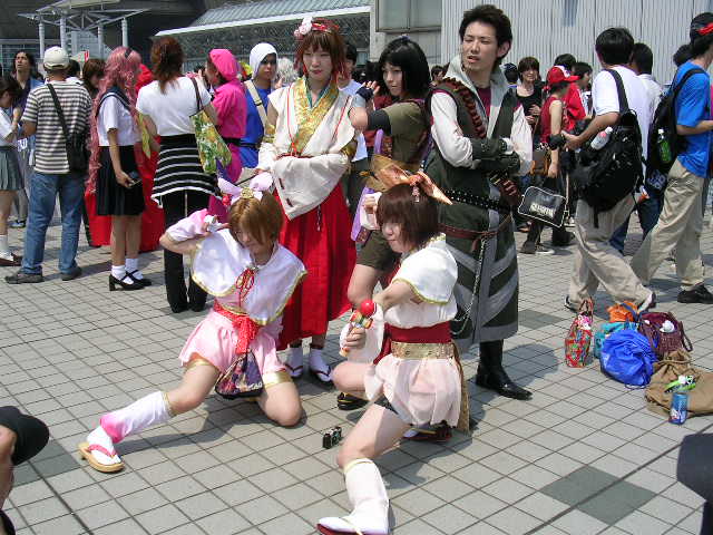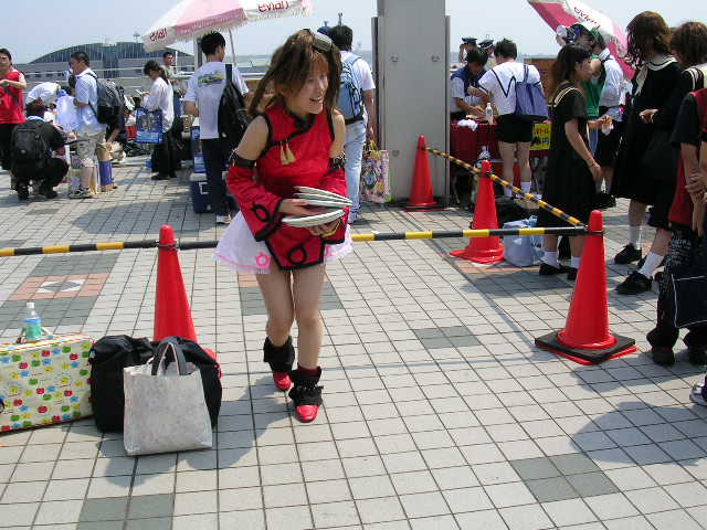 I had been in Japan a few weeks so I had grown used to big crowds, but the sight that met me when we reached the outdoor cosplay area was truly amazing (you can see just what it looked like in Pic 2 at the bottom of the page). Comiket was different from American cons in that you couldn't just take pictures of cosplayers wherever you wanted; it all had to be done in the specified fenced off outdoor area. I have to hand it to the people who stand out there all day and have their pictures taken....the oppressive heat and humidity of a Tokyo summer day was only amplified by standing in a huge crowd of people, and I could hardly imagine staying there any longer than the time I took to snap some random pictures and get out as soon as possible (you can see the pics I took at the bottom with my brand new digital camera....most of them weren't characters I recognized, I just thought they had pretty costumes, and all of them were taken while or slightly after other people took pictures of them, since I was too shy to go up and ask them myself -_-;;) Some of the more popular cosplayers (i.e., those with barely any clothes on :P) even appeared to have handlers who would only let people take pictures of the girls for a specified amount of time before giving them a break (I caught one of them mere seconds before her posing time was over!)