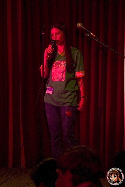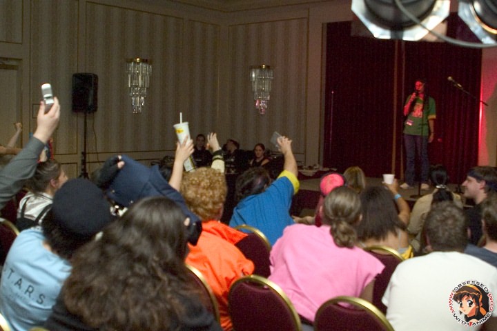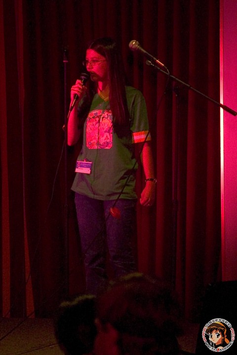 The host of the contest, Brad DeMoss, was a pretty funny guy. He even sang It's Raining Men and at the end of the contest while we waited for the judging results. But anyway, I was a bit nervous before it was my turn to go up. Once I actually got up there and sang, things mostly went pretty well, though, just like in my audition, there was one part where I spaced out and kind of forgot a line >_< Since it was a slow song, many people mimiced the motion where they pull out a lighter and wave it back and forth. Several people used their cell phones as a source of light, one woman used her Game Boy, and someone was even waving a soda cup ^_^;; (Pictures of this, taken from Obsessed With Anime, can be found at the bottom of the page. Overall, I thought my performance went pretty well. However, soon after my turn there were a couple of pretty amazing singers, so I began to doubt that I would actually win any prizes. There was an interesting intermission during the contest when the cosplay troupe known as Bakazoku got up and did some songs and stuff. They're a really funny and crazy group ^_^ Anyway, after all was said and done, I ended up not winning anything, but I still had a really fun time.
