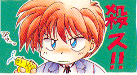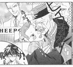 This is an amusing little picture of Dekim hugging a doll of the original Heero Yuy and crying out his name (it looks like he has some kind of shrine to him o_O;;)...the current Heero is twitching and holding his gun as he views this scene ^_^ The writing behind him says "korosu" ("kill"): "Heeroooooo!"