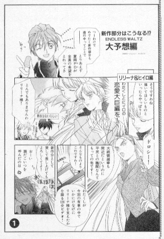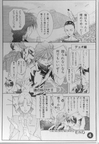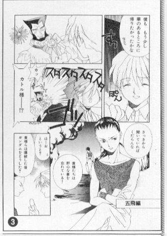 This particular book isn't a doujinshi itself; rather, it's the manga adaptation of the Gundam Wing radio play. Still, in the back there are some little stories and pictures that I deemed worthy of putting on this page ^_^