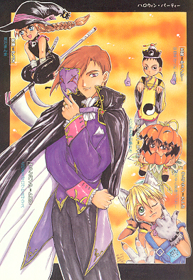 Next is a Halloween picture of the G-boys. Heero is a pumpkin, Duo is Shinigami, Trowa is a vampire, Quatre is the wolfman, and Wufei is...umm, a spirit or something (I don't know what "kyonshii" means ^_^;;): G-boys Halloween party