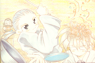 In this picture, Wufei appears to be working at a noodle place...and he's getting yakisoba all over Heero ^_^: Yakisoba master Wufei