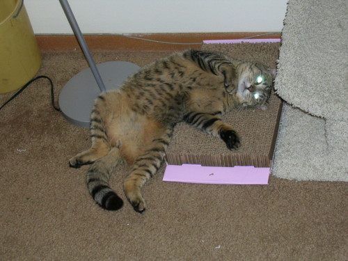 Favorite animals: I've always been a cat person (and a Trigun personality quiz said that I'm most like Kuroneko-sama, so I guess that applies literally ^_^;;). I currently have a cat named Leopold....he's my chubby wubby wittle baby (yes, I'm one of those people who speaks absolute cutesy absolute nonsense to my kitty ^_^) Here's a picture of him looking crazy with his big glowy eyes: